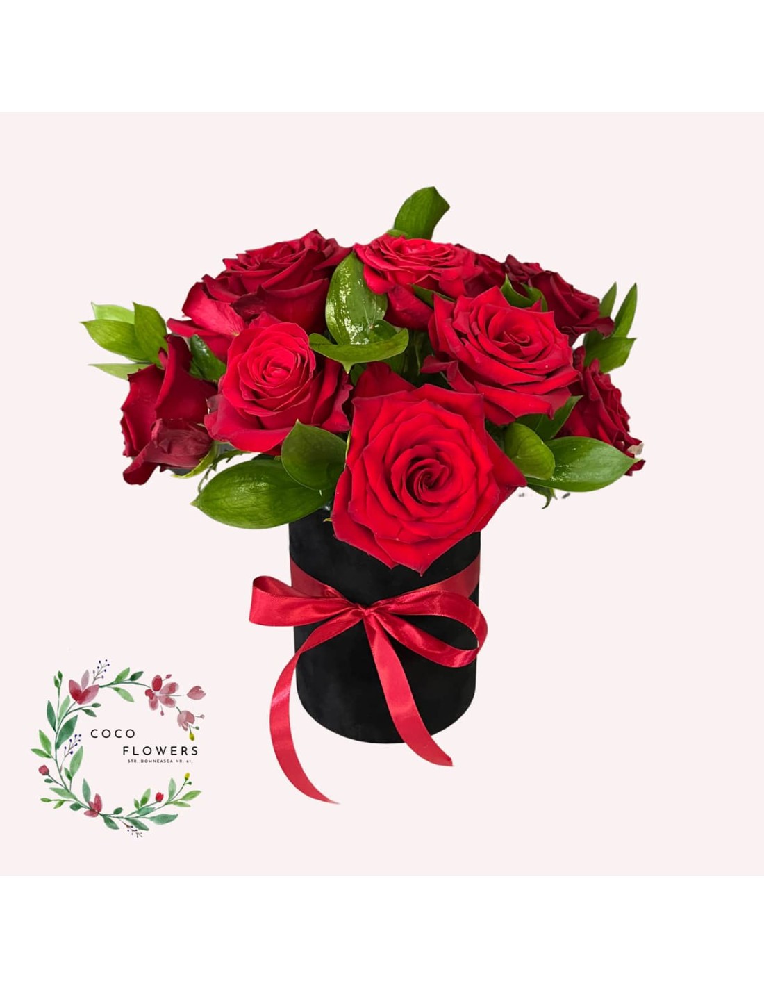 Acest aranjament conține: cutie de catifea, 11 trandafiri roșii, ruscus și alte materiale