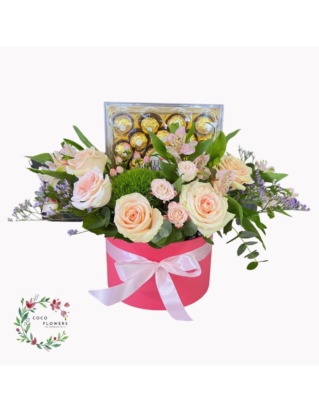 Acest aranjament conține: cutie xl, praline Ferrero Rocher, trandafiri Pink-mondial, dianthus, miniroze, Alstroemeria limonium și hipericum, și alte materiale